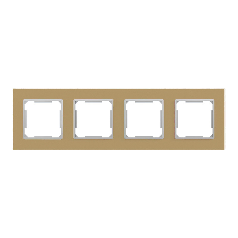 Elegáns, arany színű ELDLUX ELDIRA négyszeres üveg keret villanykapcsolókhoz és konnektorokhoz. Modern, letisztult megjelenést ad a helyiségnek, jól illeszkedik üvegkeretes szerelvénycsaládokhoz és prémium belső terekhez.